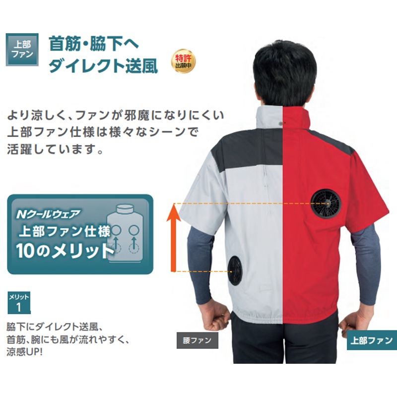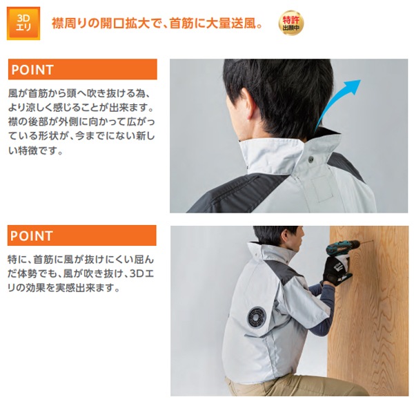 背中と肩の特殊スペーサーにより、立体的に風路を形成し背中から首筋へ風を通す設計です。