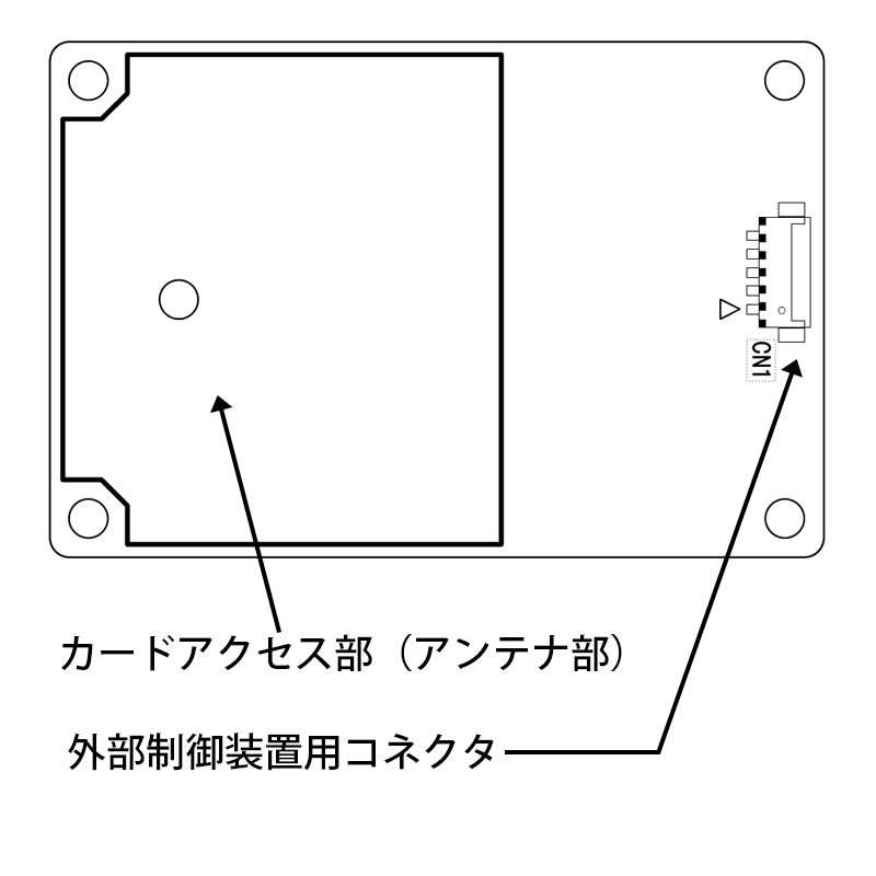 パソコンなどから、RS232C経由で本機を制御することが出来ます。 本機に内蔵されたアンテナのアクセスエリア内にあるカード内のデータを読み書きするためのリーダーライターです。